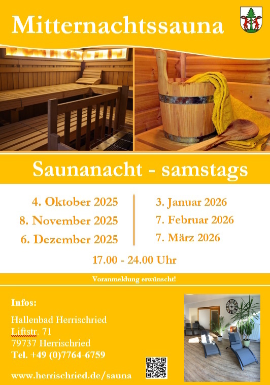 Angegliedert an das Hallenbad Herrischried befindet sich der Saunabereich mit einer finnischen 90 Grad Sauna sowie einer Infrarotkabine. Der große, neu gestaltete Ruheraum lädt zum Verweilen nach den Saunagängen ein. Direkt angeschlossen ist das Hallenbad, welches zu den normalen Hallenbadöffnungszeiten genutzt werden kann. Öffnungszeiten: